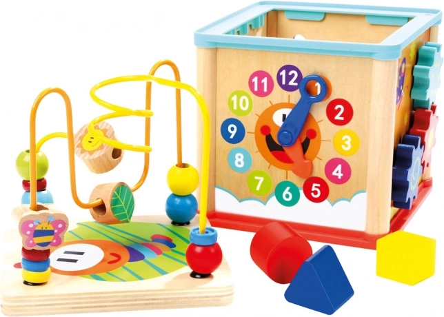 Acest cub motric colorat din lemn oferă copiilor de la 12 luni numeroase modalități de a se juca și a învăța în același timp. Cu ajutorul ceasului cu limbi, copiii se familiarizează într-un mod ludic cu noțiunea de timp, labirintul cu mărgele dezvoltă prinderea și coordonarea, iar celelalte laturi ale cubului exersează logica, formele și culorile.
