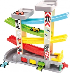 La baza pistei se află trei garaje cu ușițe deschise, care servesc nu doar ca parcare, ci și ca spațiu practic de depozitare și opțiune pentru transportul ușor al jucăriei. Combinația robustă de lemn, plastic și metal asigură durabilitate și joc în siguranță, în timp ce culorile vii atrag atenția și stimulează curiozitatea.