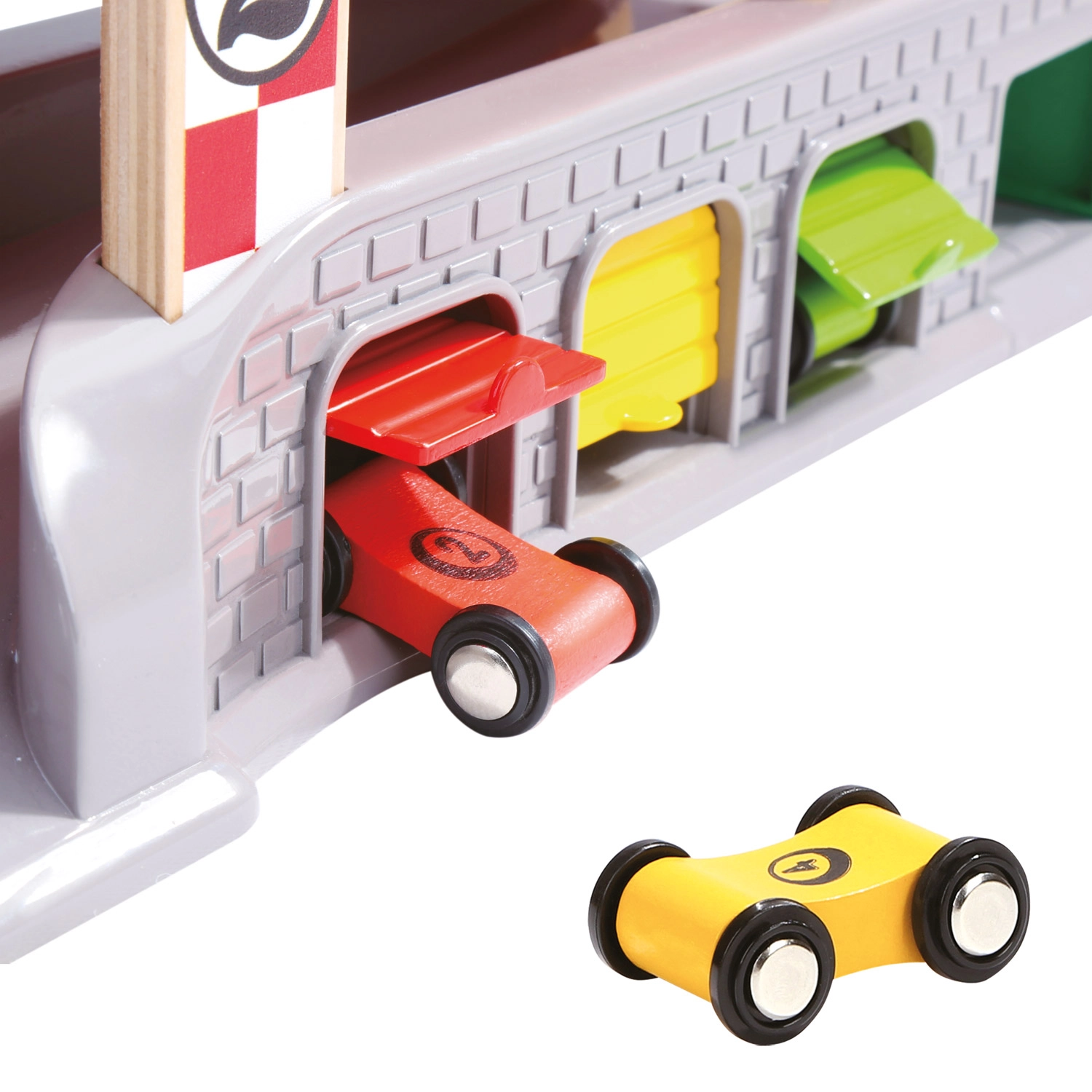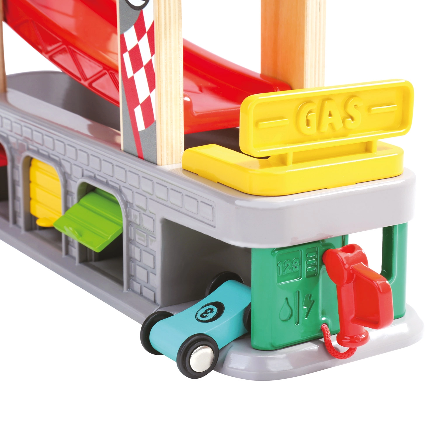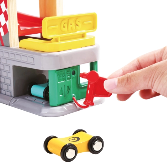 Trei garaje cu uși rabatabile și stație de alimentare susțin scenarii pline de imaginație – de la opriri la service până la parcare și sortarea mașinuțelor.