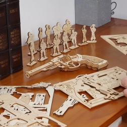Revolverul este realizat din lemn de calitate, iar piesele sale sunt tăiate cu precizie, asigurând o asamblare perfectă.