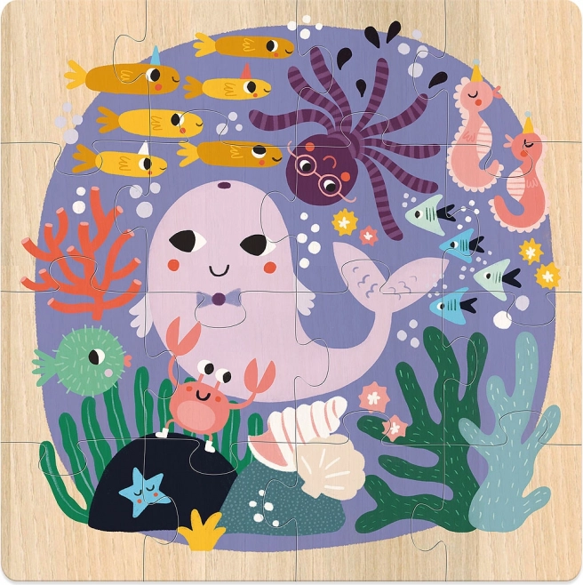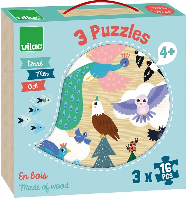 Descoperiți lumea minunată a naturii prin acest set de puzzle-uri de lemn. Fiecare dintre cele trei imagini ilustrează o temă diferită: exploratori printre nori, lumea submarină și aventuri în junglă. Scena de pe cer încântă cu un păun frumos, un vultur și alte păsări. Motivele marine prind viață cu o balenă mare, o caracatiță și peștișori prietenoși. Scena terestră include un tigru, un crocodil și un papagal într-un mediu vesel de junglă.