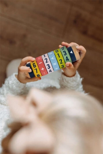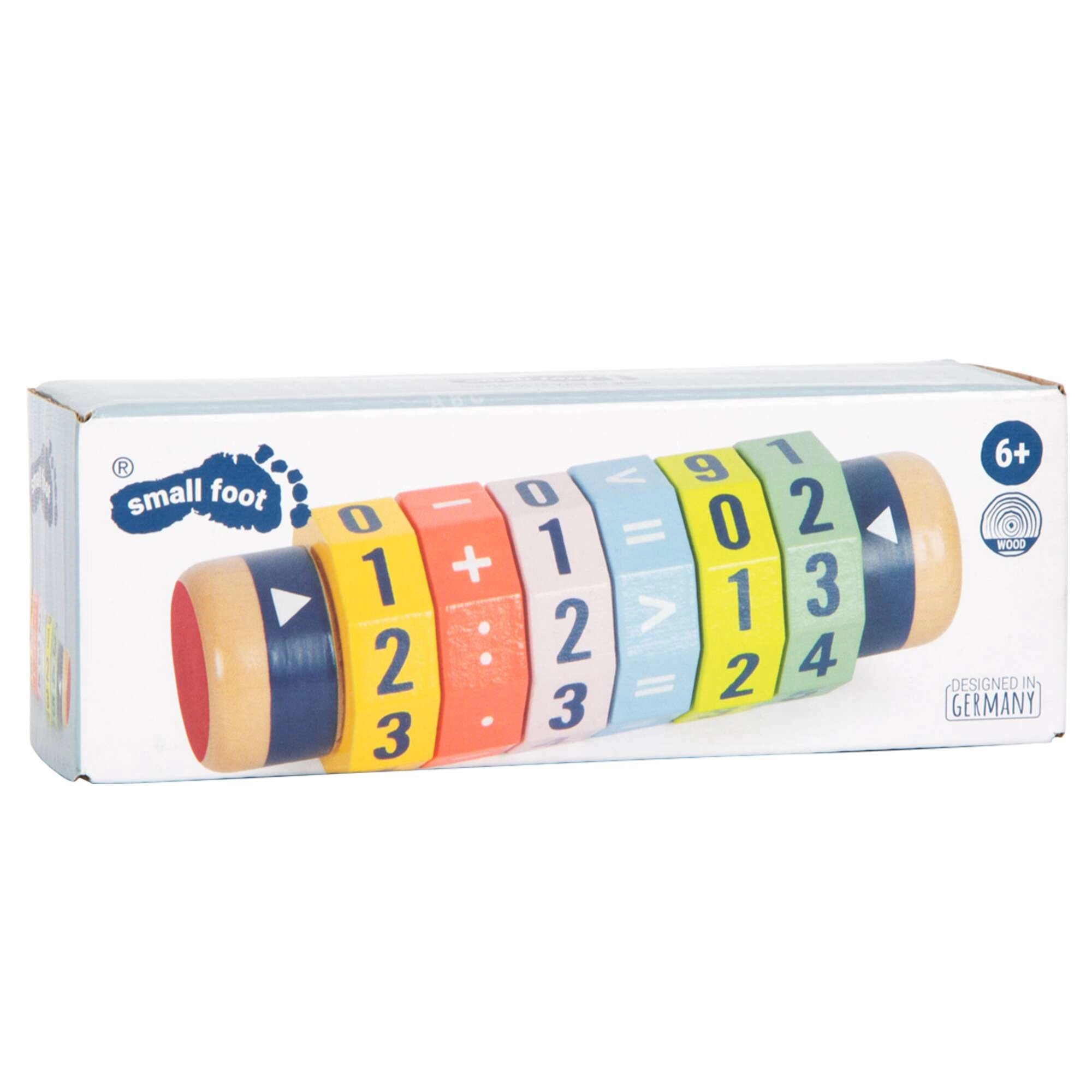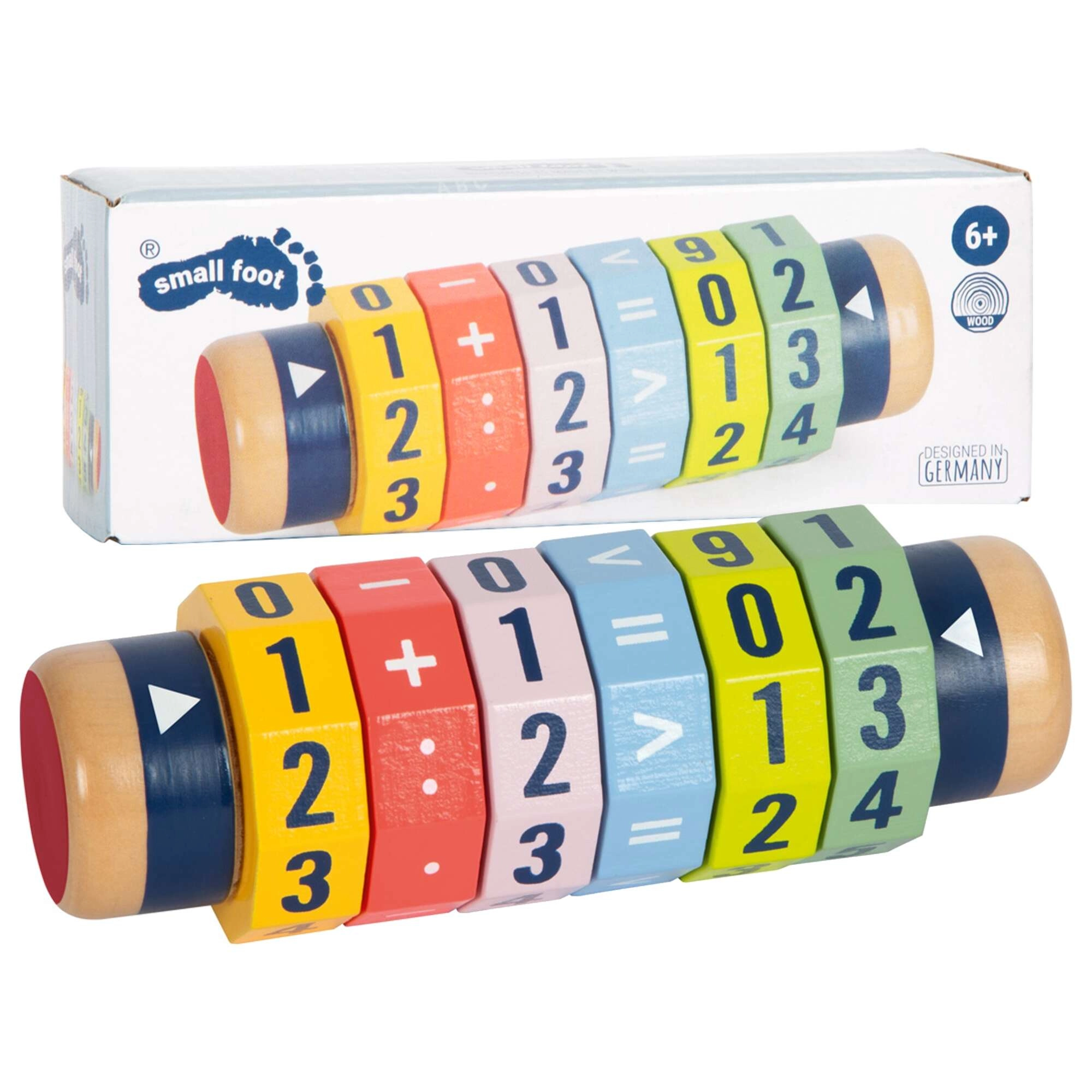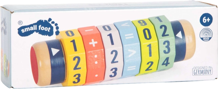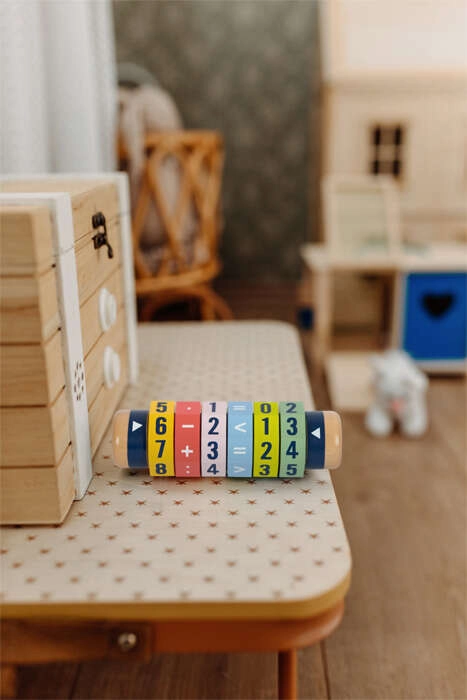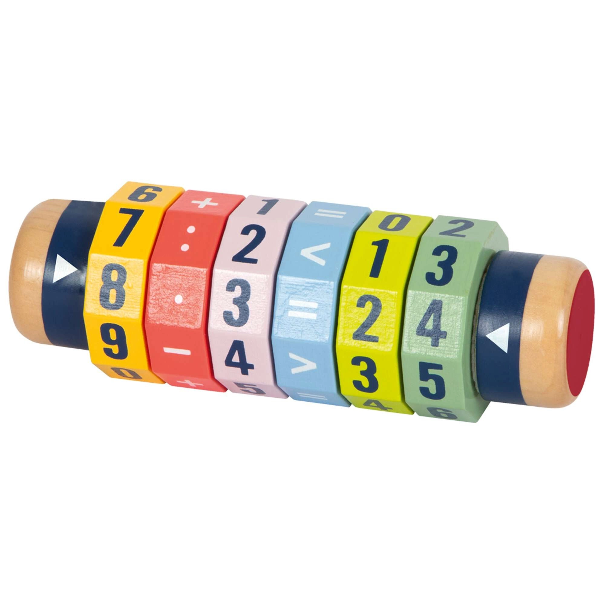 Descoperiți drumul distractiv către matematică. Cilindrul din lemn cu șase inele rotative le permite copiilor să creeze ecuații simple și mai complexe și să compare numere. Datorită culorilor vii și cifrelor evidențiate, copiii învață într-o manieră ludică și își dezvoltă motricitatea fină și capacitatea de concentrare.