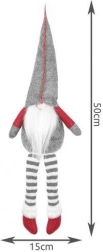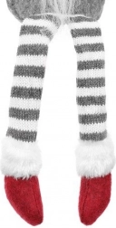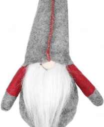 Spiriduș decorativ din textile, în combinație gri-roșu, are o căciulă înaltă ascuțită, picioare lungi în dungi și o barbă albă moale. Datorită profilului special pe partea din spate, stă stabil pe marginea unei mese sau a unui raft și conferă interiorului o notă caldă și primitoare.