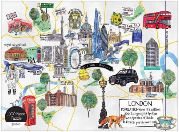 Acest puzzle de design aduce o hartă bogată și detaliată a LONDREI cu repere iconice precum Buckingham Palace, Trafalgar Square, Royal Albert Hall, Tower Bridge sau London Eye. Ambalajul stilat cu finisaj mat încântă atât ca dar, cât și ca piesă decorativă pentru bibliotecă. Autorul ilustrației: Hennie Haworth.