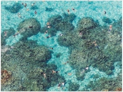 Schimbă starea de spirit: o plajă aglomerată văzută de sus și o mare turcoaz liniștită cu stânci. Dublul impact vizual prelungește distracția și lărgește plaja de dificultate.