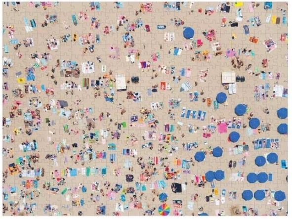 Puzzle-ul reversibil, inspirat de fotografiile aeriene iconice semnate Gray Malin, aduce o provocare atrăgătoare și, totodată, un rezultat decorativ. O față surprinde o plajă aglomerată din perspectivă aeriană, cealaltă liniștea oceanului cu stânci și înotători. Datorită finisajelor diferite (lucios/mat) recunoști ușor ce parte asamblezi.