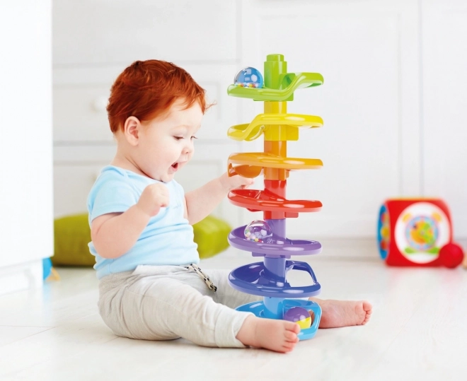 Spiral Tower include piese mari și colorate, sigure pentru copiii mici. Astfel, se pot juca în siguranță și își pot dezvolta percepția senzorială.