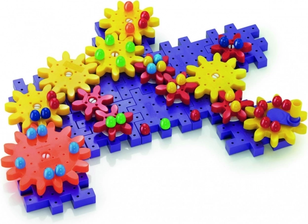 Setul de roți dințate și figuri colorate permite copiilor să construiască structuri diverse, învățând astfel într-un mod distractiv bazele mecanicii.
