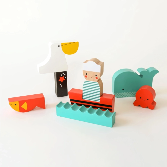Puzzle-ul din lemn Pe mare PETIT COLLAGE aduce copiilor bucuria descoperirii. Din piesele individuale se poate forma o imagine cu marinar, balenă sau caracatiță, ori pot fi folosite ca figurine independente pentru joc deschis. Piesele au margini plăcute, sunt rezistente și intens colorate, invitând la reasamblări repetate.