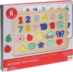 Puzzle-ul de inserție Petit Collage cu numere și forme reprezintă o modalitate excelentă de a-i învăța pe copii bazele matematicii și recunoașterea formelor. Conține 22 de piese și 3 carduri față-verso cu vocabular în șase limbi diferite: engleză, spaniolă, franceză, germană, olandeză și italiană. Puzzle-ul este realizat din lemn de înaltă calitate, certificat FSC®, care asigură o producție ecologică și durabilă.