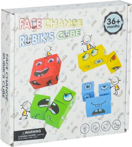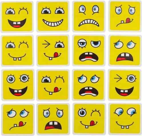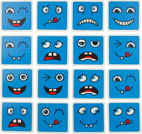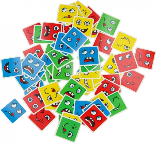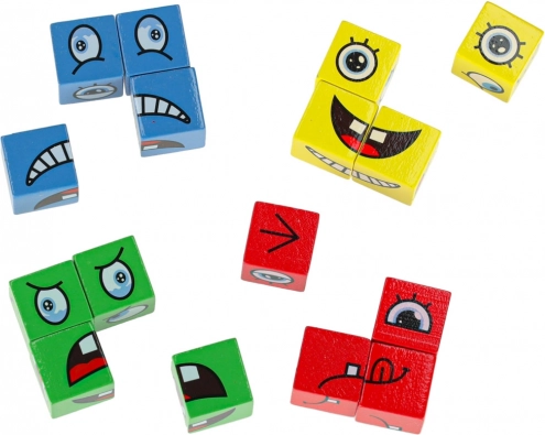 Joc logic distractiv pentru copii și adulți, care dezvoltă recunoașterea emoțiilor, gândirea logică și motricitatea fină. Întoarce cuburile din lemn colorate și, după indicațiile de pe cărți, compune expresia facială corectă – câștigă cel care creează cele mai multe combinații în cel mai scurt timp. Execuție sigură din lemn, 64 de cărți cu expresii și 16 cuburi în patru culori pentru porții nesfârșite de distracție și învățare.