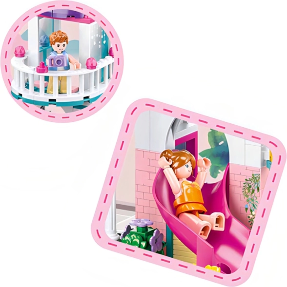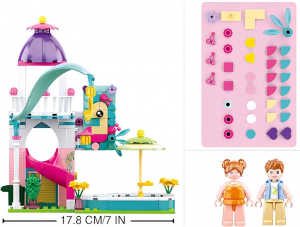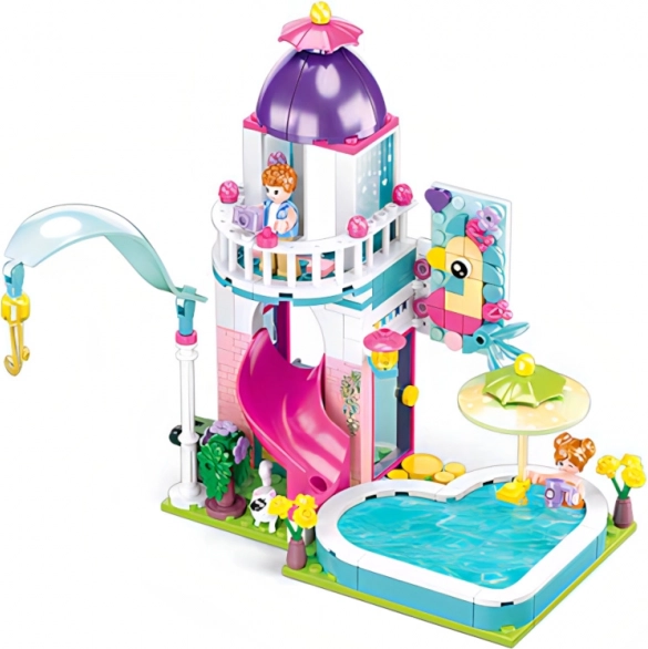 Sluban căsuță cu tobogan spre piscină este un set de construcție distractiv și creativ, care poate fi combinat ușor cu alte seturi. Dezvoltă excelent imaginația și abilitățile motorii ale copiilor.