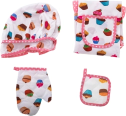 Cu acest set de bucătărie drăguț, copiii pot descoperi magia gătitului direct în bucătăria dvs. Ideal pentru dezvoltarea abilităților manuale și colaborarea dintre părinți și copii, acest set nu va dezamăgi. Include șorț, mănușă, bonetă de bucătar și suport pentru vase fierbinți, toate decorate cu brioșe colorate, înveselind fiecare activitate de gătit.