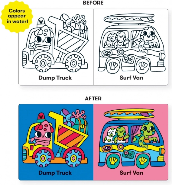 - Efect interactiv de culoare – imaginile se luminează și devin vizibile după umezire.