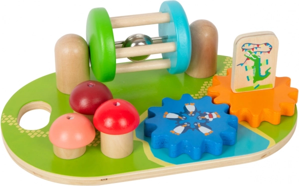 Placa din lemn oferă diverse elemente mobile precum rotițe dințate și ciuperci pentru dezvoltarea motricității fine.