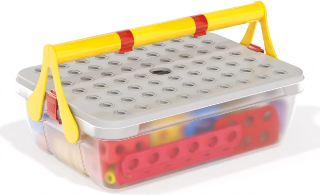 Toate piesele se depozitează în cutia solidă cu mâner. Capacul perforat servește drept suprafață de construcție – ideală acasă și în călătorii.