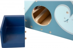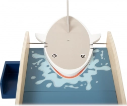 Transformați orice cameră sau grădină într-un mini teren de joc! Minigolful din lemn cu gura de rechin oferă copiilor distracție dinamică și antrenament pentru motricitatea grosieră, coordonarea mână–ochi și răbdare. Lansați mingea pe rampa albastră ca pe un val și nimeriți gura deschisă – la lovitură, rechinul o închide, iar voi marcați scor.