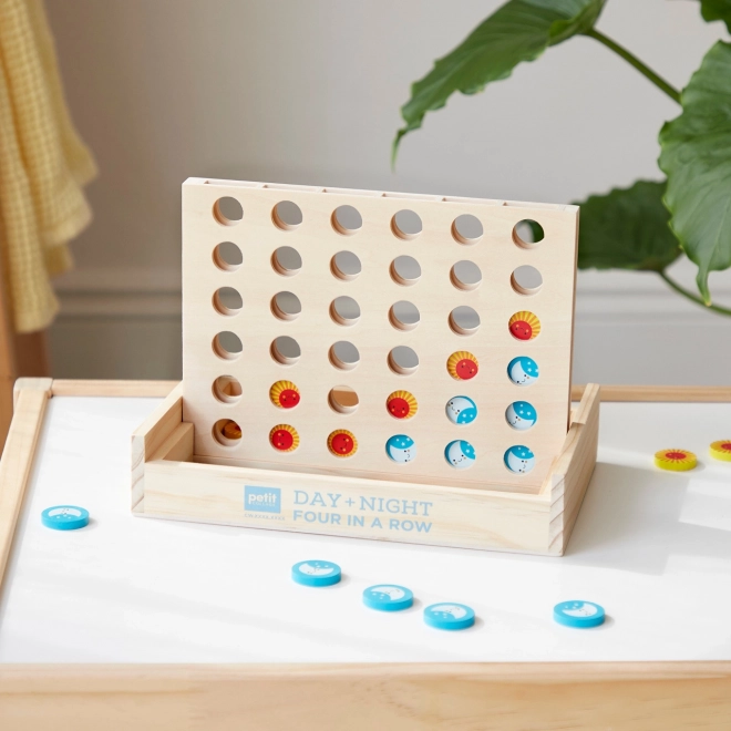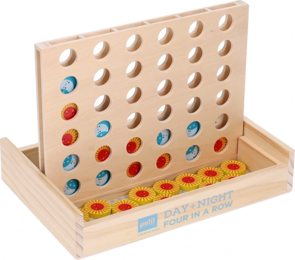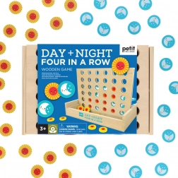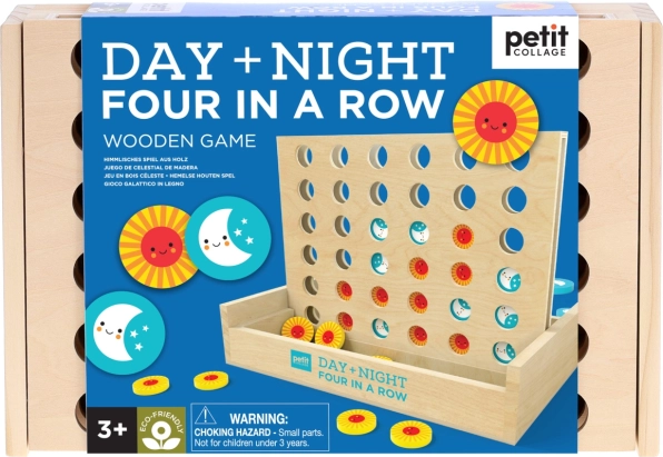 Jocul din lemn patru la rând ziua și noaptea necesită nu doar gândire rapidă, ci și capacitate de planificare strategică. Scopul este să plasezi patru jetoane consecutive pe grilă. Jetoanele au un design atrăgător de soare și lună care va captiva și încânta jucătorii mici și mari deopotrivă.