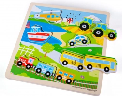 Puzzle-ul conține diferite mijloace de transport care le permit copiilor să cunoască mai bine lumea din jurul lor.