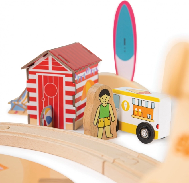 Acest circuit feroviar de coastă aduce multă distracție creativă și învățare într-un singur set. Copiii pot circula pe traseu, pot trece prin marele castel de nisip, pot trece pe lângă căsuțele de plajă colorate și, în același timp, pot învăța să sortese deșeurile datorită plăcilor magnetice cu închidere. Totul este realizat din materiale obținute responsabil, cu vopsele și lacuri sigure.