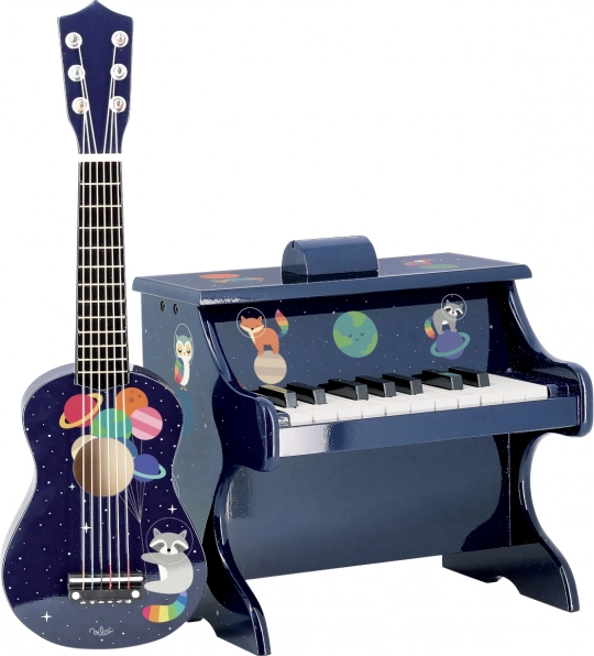 Vă prezentăm Chitara Spațială, instrumentul ideal pentru micii muzicieni și iubitorii de aventuri spațiale. Această chitară pentru copii este fabricată din lemn, garantând calitate și durabilitate. Designul său este îmbogățit cu motive planetare colorate și o ilustrație cu un raton astronom care o face o jucărie de vis adevărată.