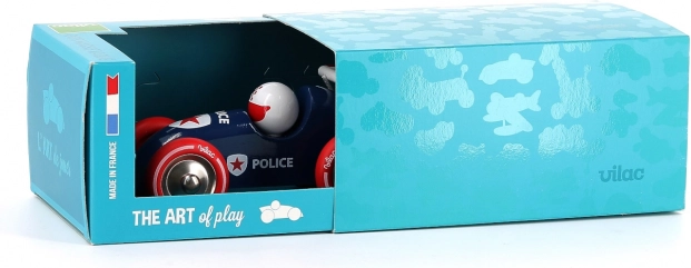 Mașinuța de curse cu aripă, de tras, poliție Vilac este o jucărie originală care îi va încânta pe copii prin designul său unic și calitatea sa superioară. Datorită sforii atașate, poate fi un companion constant în aventurile lor prin cameră sau casă.