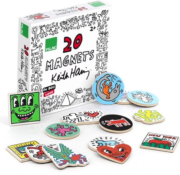 Adu în casa ta energia jucăușă a pop-artului! Setul de 20 de magneți din lemn VILAC cu motive KEITH HARING oferă un design inconfundabil, culori vii și bucuria de a crea. Datorită execuției solide din lemn și imprimării lucioase, magneții sunt ideali pentru utilizare zilnică pe frigider, tablă magnetică sau rafturi.