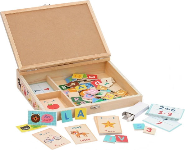 - Tablă, 2 crete, 70 piese din lemn (litere, cifre, semne), 80 carduri cu vocabular, 30 carduri cu exerciții de calcul, 12 carduri de punctaj