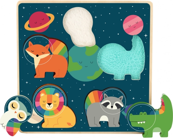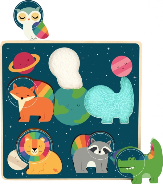Bucurați-vă copiii cu un puzzle de inserție având tema astronauților animali, care nu doar că impresionează prin originalitate, dar și prin execuția stimulatoare. Fiecare piesă ascunde sub textura sa o suprafață diferită, extinzând posibilitățile de cunoaștere și diferențiere a senzațiilor distincte.