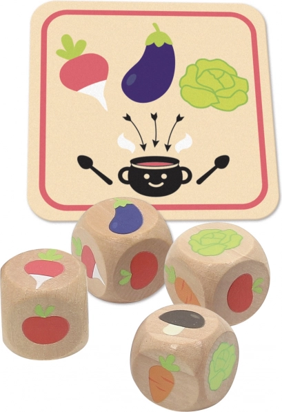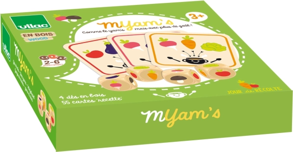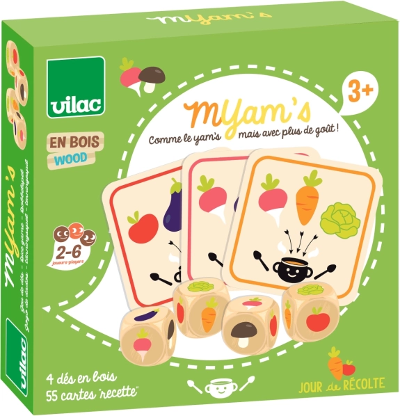 Joc de familie distractiv cu zaruri, Vilac – Ziua recoltei, îi invită pe copii de la 3 ani să arunce rapid și să adune rețete. Setul include 55 de cărți de joc și 4 zaruri, se joacă în 2–6 jucători. Reguli simple, realizare frumoasă și imagini cu legume care susțin numărarea, concentrarea și spiritul de observație.