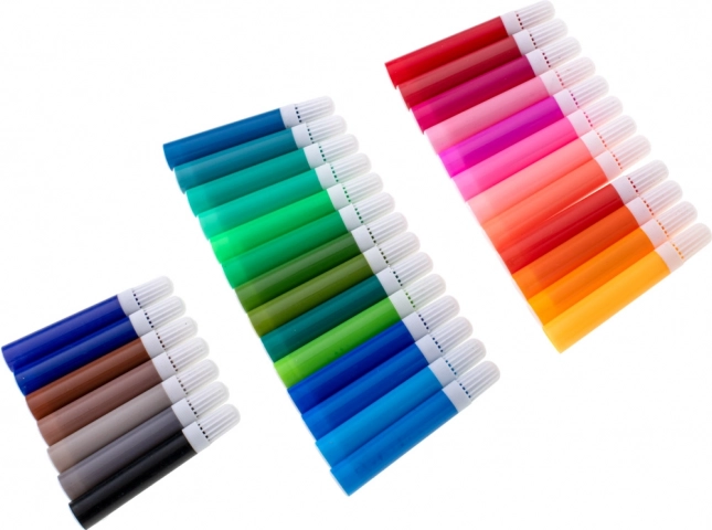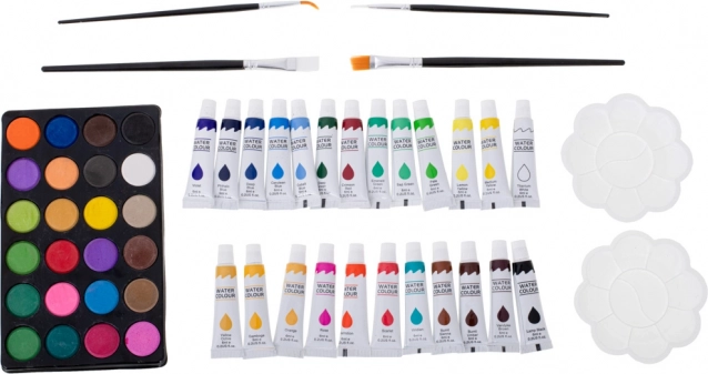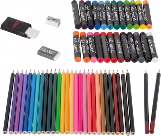 - 33× marker, 28× creion colorat, 4× pensulă, 2× creion, 2× radieră, 2× paletă din plastic, 1× ascuțitoare, paletă cu 24 culori acuarelă, 24× vopsea la tub, 24× pastel uleios, valiză