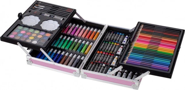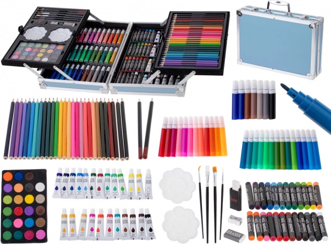 - Echipare completă, 145 piese: markere, creioane colorate, pensule, creioane, radiere, acuarele, vopsele la tub, pasteluri uleioase, palete și ascuțitoare.