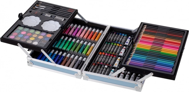 Set artistic universal într-o valiză practică, oferă totul pentru artiști mici și mari. Găsești în el o gamă largă de culori și instrumente pentru desen și pictură – de la markere și creioane colorate la acuarele, vopsele la tub și pasteluri uleioase. Valiza compactă albastră cu închizători solide păstrează totul organizat la locul său și este ideală acasă, la școală și în călătorii. 145 de piese pentru creativitate nelimitată și dezvoltarea imaginației.