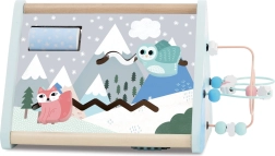 Jucăria include un labirint de mărgele și diverse alte elemente care îmbunătățesc abilitățile de motorică fină ale copilului dvs.