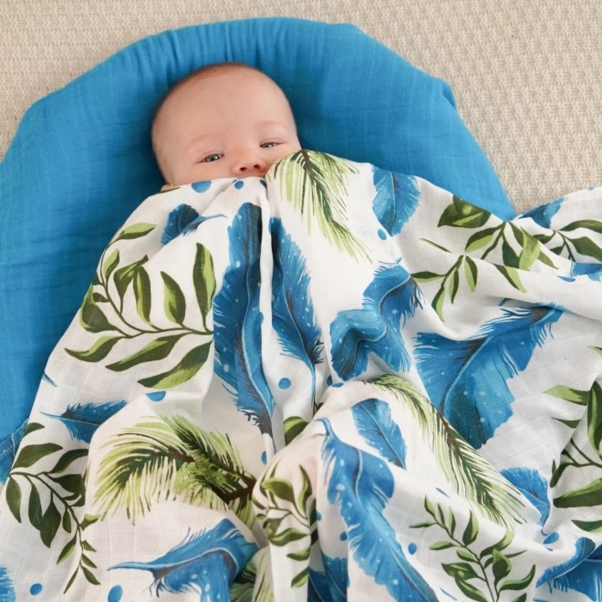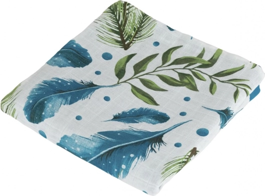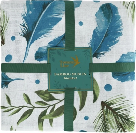 Îmbrăcați bebelușul dumneavoastră în confort și finețe. Această pătură din muselină de bambus este proiectată pentru confort maxim, având un frumos motiv cu pene și frunze. Realizată din 70% bambus și 30% bumbac, este ideală pentru zilele călduroase datorită respirabilității și senzației răcoroase.