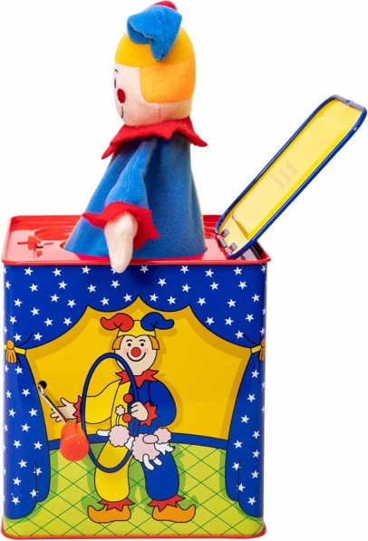 Cutia muzicală clovn este o jucărie atemporală realizată din tinichea cu un design frumos, care garantează ore de distracție. Pur și simplu rotiți manivela și ascultați melodia unui cântec cunoscut „Pop Goes The Weasel”, până când clovnul colorat apare.