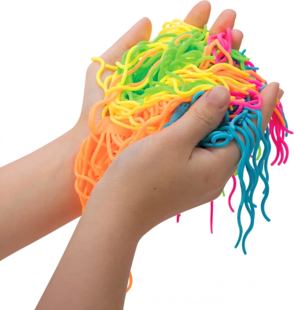 NEE DOH NOODLIES sunt „tăiței” moi, elastici și incredibil de amuzanți, care pot fi întinși, răsuciți și împletiți la nesfârșit. Funcționează excelent ca jucărie fidget antistres – reduc tensiunea, îmbunătățesc concentrarea și oferă o experiență tactilă plăcută fără mizerie.