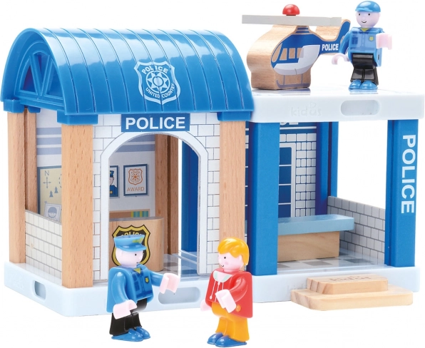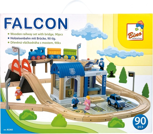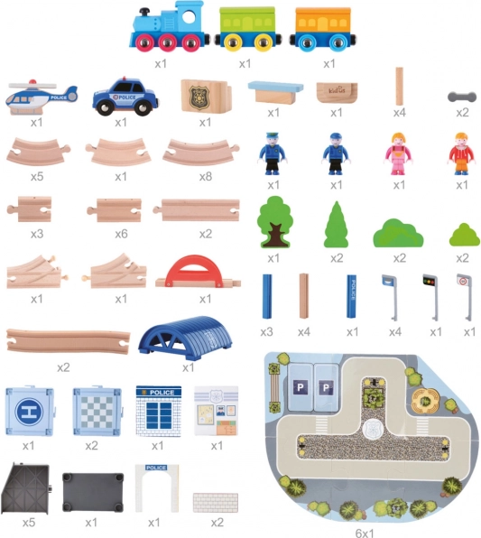 Această circuit feroviar din lemn detaliat este ideal pentru micii ingineri care iubesc trenurile și aventurile polițienești. Include un circuit cu pod, stație de poliție atrăgătoare și alte accesorii, inclusiv o mașinuță și un elicopter.