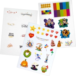 Trei coli de autocolante și cinci etichete inscriptibile adaugă cadoului o notă personală – de la felicitări până la mesaje romantice.