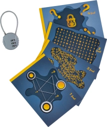 În pachet găsești tot ce ai nevoie: cutie, lacăt, 4 carduri cu indicii, 3 coli de autocolante decorative și 5 etichete inscriptibile pentru personalizare. Compartimentul interior cu dimensiunile 11,5 × 11,5 × 10,5 cm găzduiește un mic cadou, un voucher sau un mesaj personal. Produs fabricat în UE și însoțit de instrucțiuni ilustrate în engleză și germană.