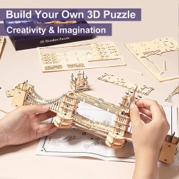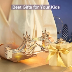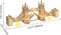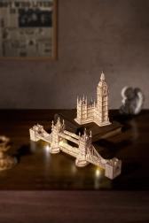 Descoperă atmosfera Londrei cu un model realist Tower Bridge din placaj de calitate. Piesele se îmbină perfect, astfel încât construcția este cursivă și plăcută. Iluminarea LED integrată oferă construcției finale o notă plăcută de seară și pune în valoare detaliile arhitecturale atent gândite.