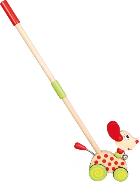 Cățelul de împins pe băț din lemn de la Bino este o jucărie de mișcare îndrăgită, care motivează copiii să meargă și să fie activi. Atunci când este împins în față, cățelul cu clopoțel clinchete ușor, ceea ce îi distrează pe cei mici și îi încurajează să mai facă pași. Roțile cauciucate asigură o rulare lină și silențioasă pe diverse suprafețe.