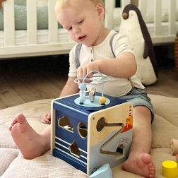 Cubul oferă elemente interactive precum labirinturi cu mărgele, trasee și potrivire de forme, care sprijină abilitățile de recunoaștere a culorilor și formelor.