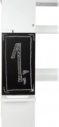 Tabla de pe lateralul standului permite scrierea prețurilor și mesajelor; polița păstrează creta mereu la îndemână.