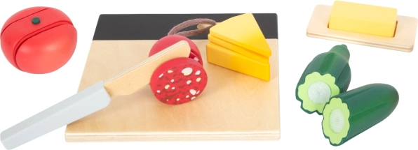 Acest set de calitate, din lemn robust, aduce tot ce le trebuie micilor bucătari: un tocător pe care se poate scrie cu cretă, un cuțit din lemn sigur și o selecție bogată de alimente – roșie, castravete, morcov, măr, banană, brânză, salam, unt și produse de panificație. Piesele individuale sunt ținute împreună cu ajutorul ariciului (scai), astfel încât copiii le pot „tăia” și reasambla iar și iar.