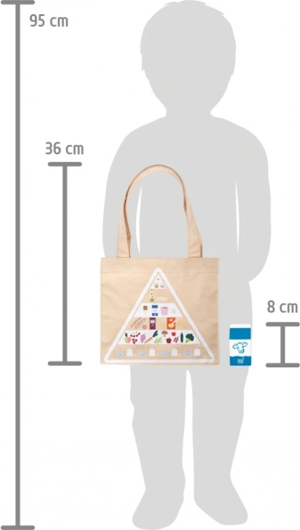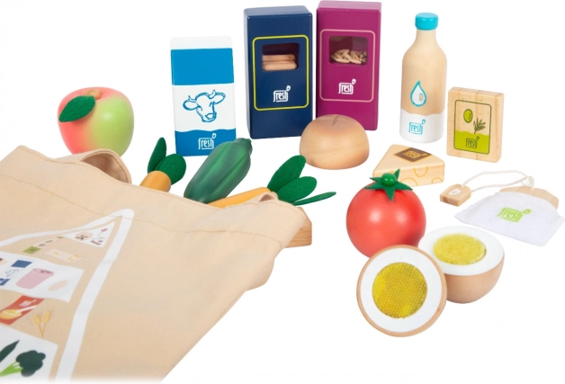 Datorită sacoșei din bumbac cu imprimeu al piramidei alimentare, copiii învață jucându-se despre alimentatia corectă, ecologie și cumpărături responsabile. Construcția durabilă din lemn și textile este plăcută la atingere și ideală pentru bucătării de jucărie și standuri de vânzare. Setul este compatibil cu alte produse din gama „Fresh”.
