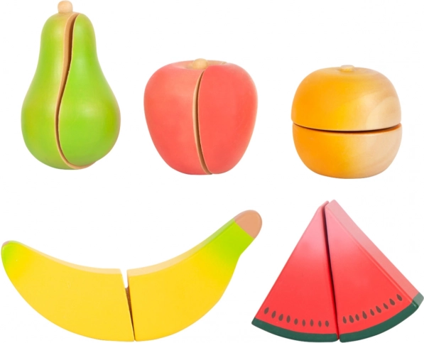 Piesele colorate din lemn (măr, pară, banană, portocală, pepene) se despart și se reunesc ușor datorită ariciului – ideale pentru exersarea tehnicii corecte de tăiere.