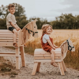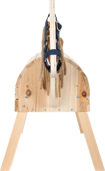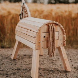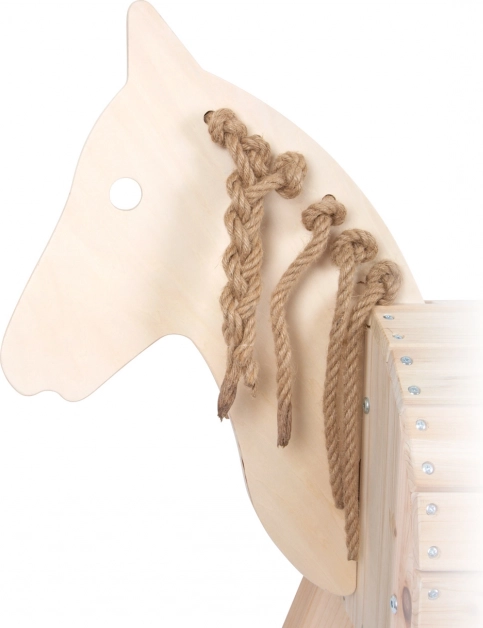 Calul din lemn pentru copii este fabricat din lemn durabil netratat, care poate fi tratat cu lac de protecție dacă este necesar. Înălțimea spatelui calului este de 50 cm, ceea ce facilitează accesul chiar și pentru copiii mai mici. Calul stă pe picioare stabile, ceea ce îl face sigur pentru joaca acasă și în exterior. Pachetul include un ham, la care se poate atașa o funie de conducere pentru o interacțiune mai mare în timpul jocului. Calul din lemn susține dezvoltarea imaginației și motricității fine a copiilor datorită coamei și cozii din sisal, pe care le pot împleti și pieptăna.