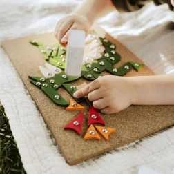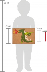 Setul include o placă de plută, ciocan de lemn, piese colorate și bolduri pentru a crea imagini.