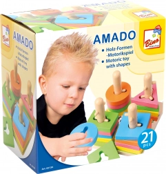 Această jucărie de înșirat din lemn, de înaltă calitate, oferă 21 de piese colorate și o bază stabilă cu țăruși. Datorită orificiilor și stâlpilor concepuți inteligent, copiii își exersează potrivirea formelor, recunoașterea culorilor și percepția spațială. Dimensiunile compacte de 15 × 11,5 × 15 cm garantează depozitare facilă și joacă pe masă sau pe covoraș.